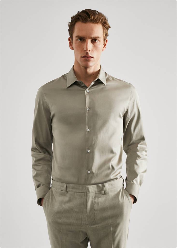 Super slim fit. Cotton poplin. Stretch cotton fabric. Long sleeves with buttoned cuffs. Button fastening at the front. Basics Collection. The beige colour is an online exclusive. Classic collar