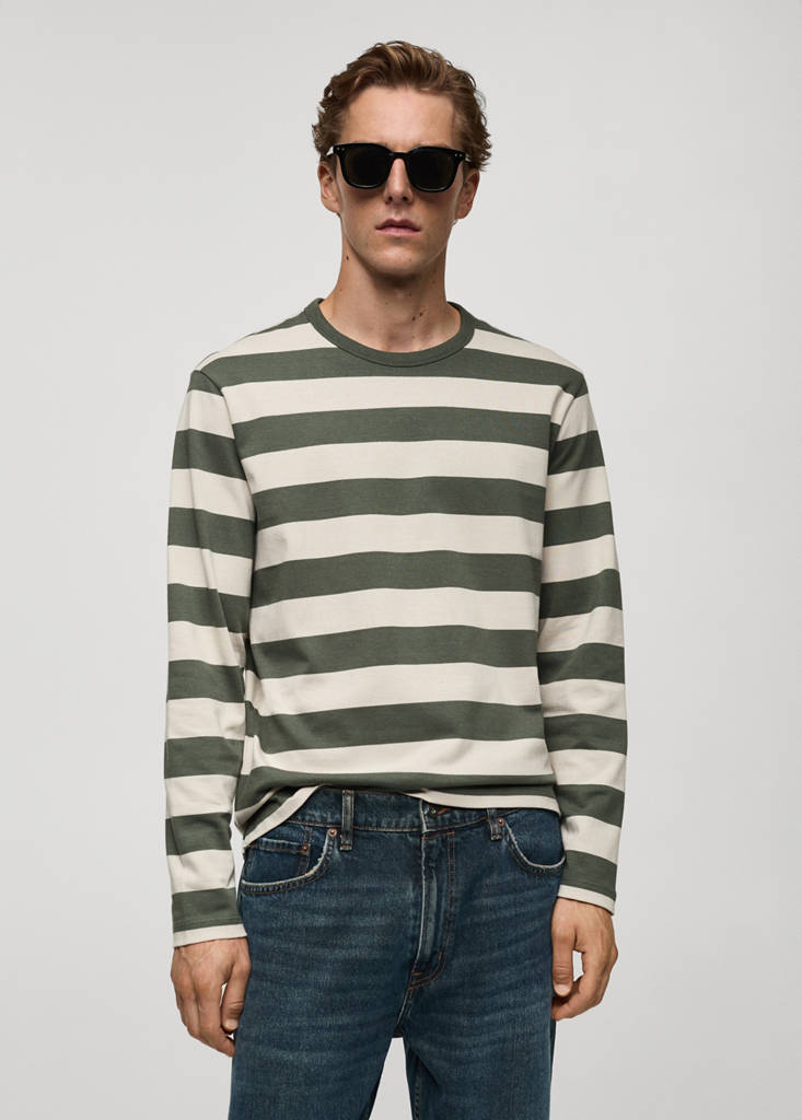Regular fit. Horizontal stripe print. Round neck with ribbed finish. Long sleeves. Straight hem. 100% cotton fabric