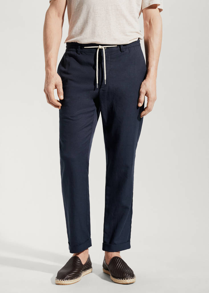 Slim fit. Linen and lyocell blend fabric. Flowy fabric. Elastic waist. Lanyard with option of visible or hidden knot on the inside. Elastic pleated on the waist. Double button and zip closure. Two side pockets. Two welt pockets on the back. Cuffed hem. Basics Collection. Antoine Griezmann Campaign