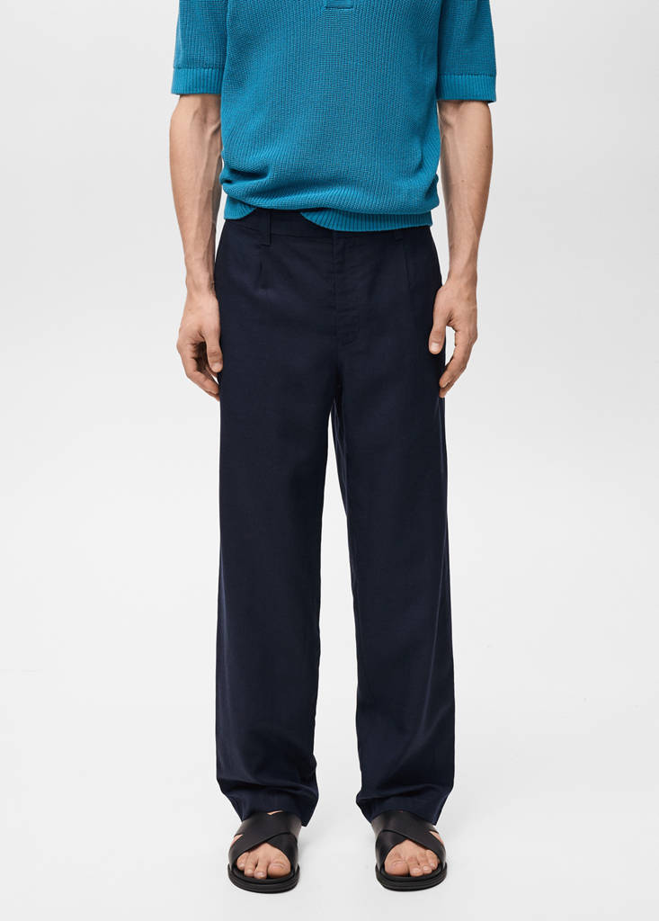 Regular fit. Linen and lyocell blend fabric. Waist with adjustable inner cord. Adjustable by elastic band on the back. Front fastening with double-breasted buttons and zip. Front pleat detail. Side pockets. Welt pocket with button on the back