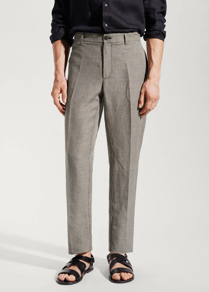 Slim fit. Linen mix. Micro houndstooth print. Zip and one button fastening. Belt loops. Two front pockets. Darts on the front. Two pockets with flaps on the back. Straight hem