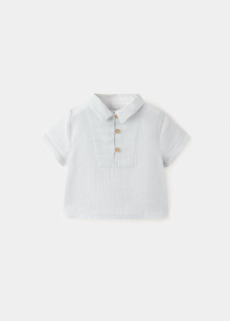 100% cotton fabric. Straight design. Stripe design. Buttoned shirt collar. Short sleeves.