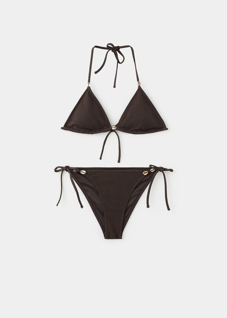 Bikini set. Stretch fabric. Triangular design. Shell beads. Thin straps. Tie fastening. Mid-rise briefs. Side Tie Closures. Inner lining.