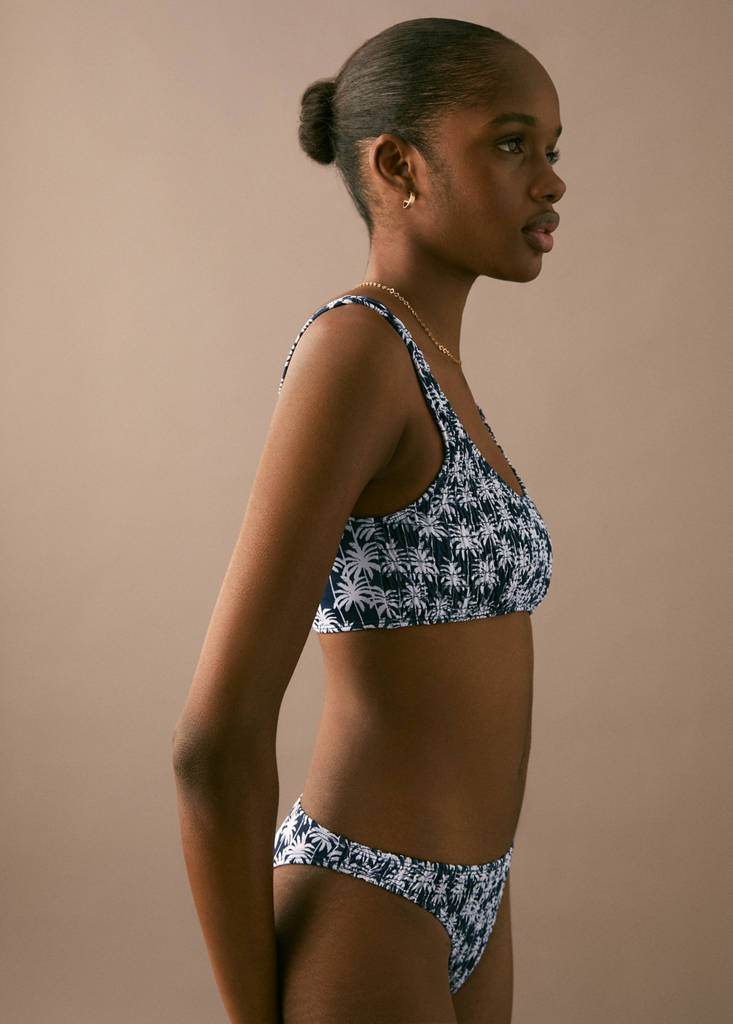 Stretch fabric. Palm tree print. Wide straps. Round neck. Elastic ruching. Mid-rise briefs. Removable foam