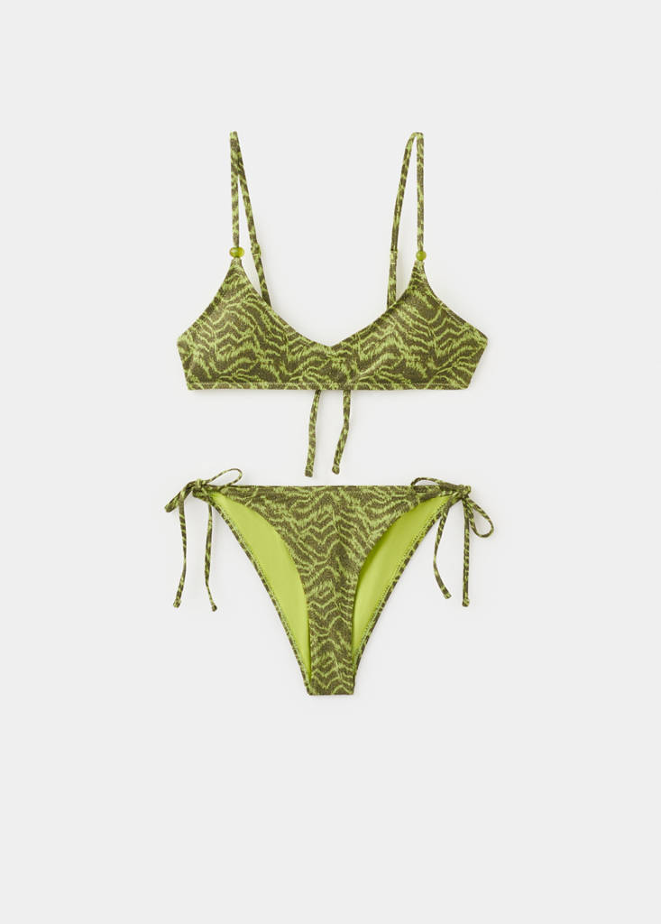 Bikini set. Stretch fabric. Triangle silhouette. Zebra design. Two-tone design. Thin adjustable straps. Bow fastening on the back. Bow details on the sides. Adjustable tie details. Detachable filling. Mid-rise briefs.
