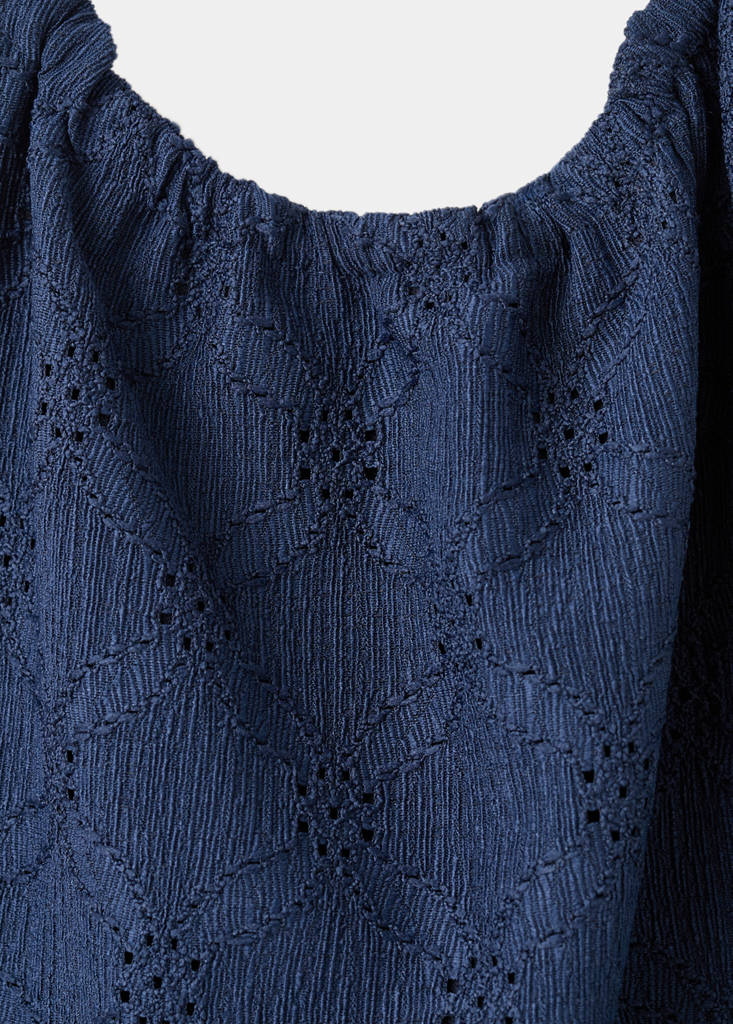 Straight design. Long design. Halter neck. Bow fastening on the neck. Embroidered details.
