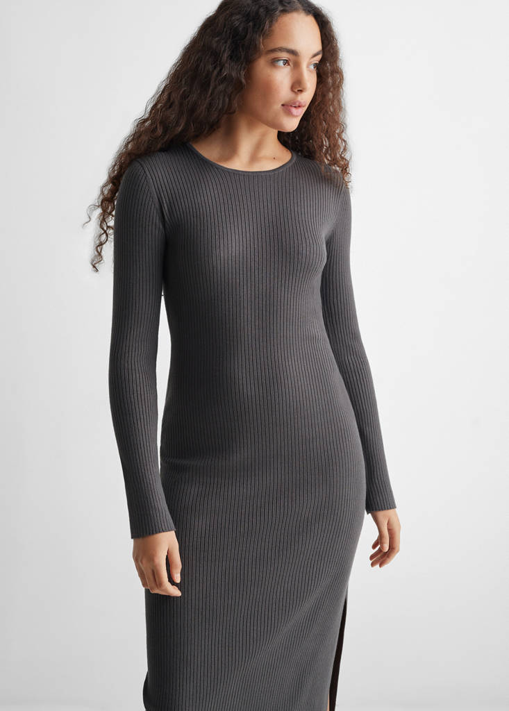 Fine knit fabric. Ribbed knit. Straight design. Long design. Midi design. Round neck. Long sleeves. Side slit. No Fastening