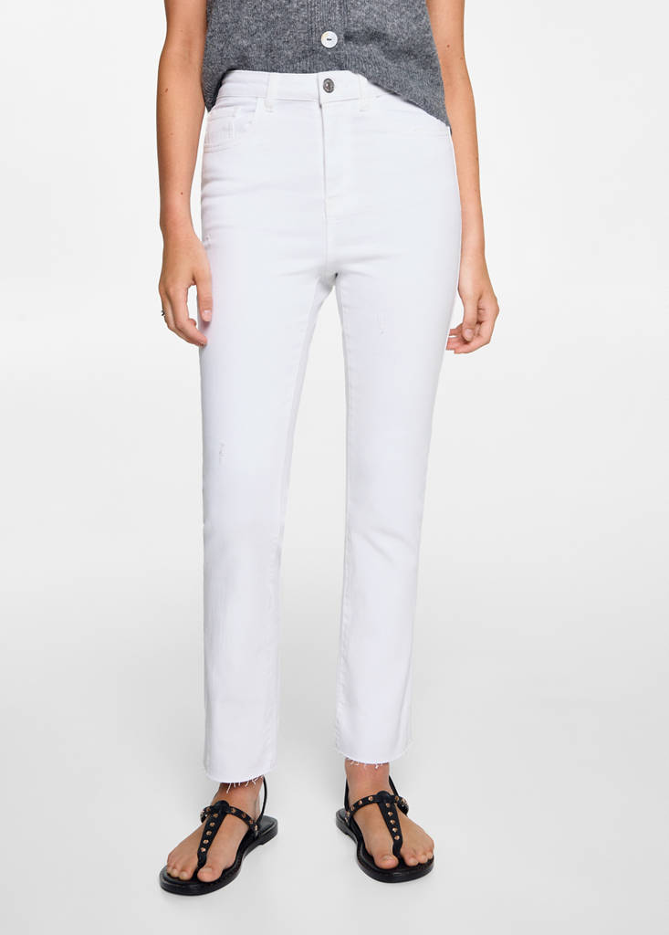 Denim-style cotton fabric. Straight design. Slim fit. Mid-rise. Frayed hem. Five pockets. Zip and button fastening