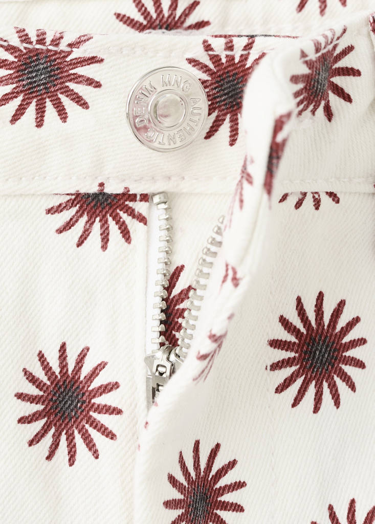 Denim-style cotton fabric. Straight design. Short design. Silhouette Mini. Flowers print. Low Waist Rise. Belt loops. Five pockets. Zip and button fastening.