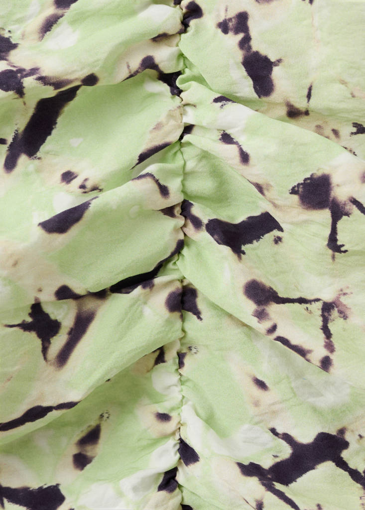 Fluid fabric. Straight Design. Short design. Tie-dye design. Shaved design. V-neckline. Thin straps. Bow detail on the neckline. Zip closure