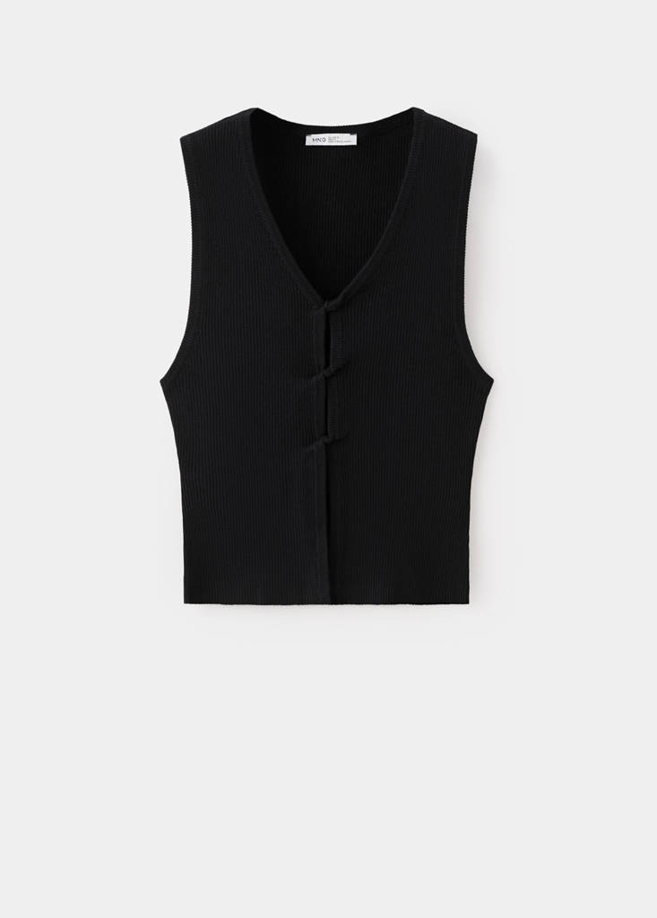 Ribbed knit fabric. Straight design. V-neckline. Sleeveless. Frog fastener.