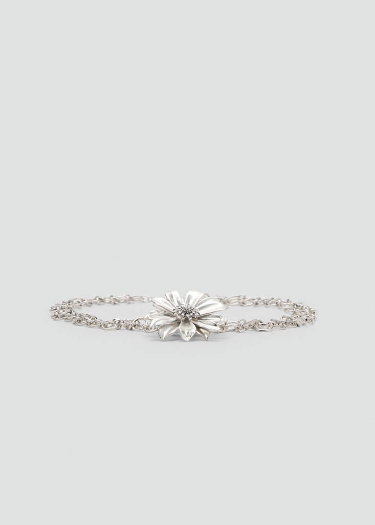Fine metal chain. Flower detail. Zip and carabiner fastening. Party, ceremony and communion collection