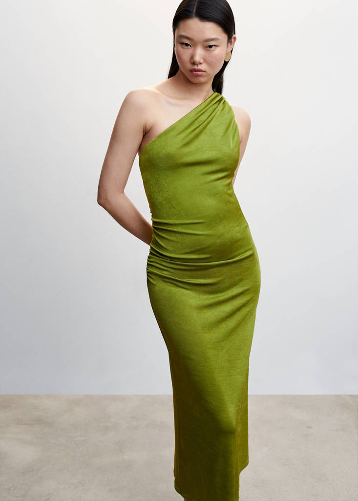 Flowy fabric. Asymmetric design. Fitted design. Long design. Asymmetrical neckline. Wide strap. Unclosed. Draped details