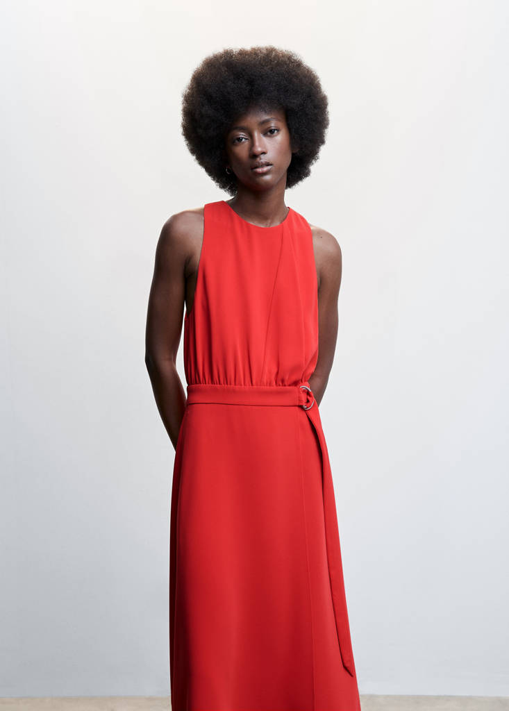Flowy fabric. Midi design. Evasé design. Rounded neck. Sleeveless. Invisible back zip fastening. Adjustable belt. Inner lining. Party and events collection