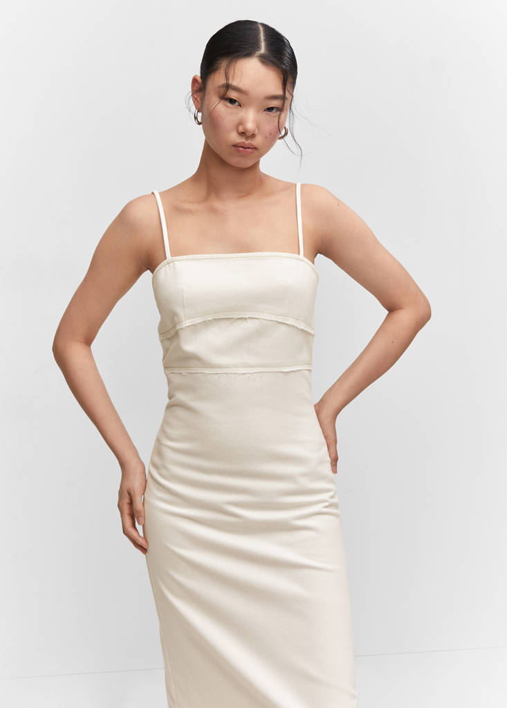 Denim-style cotton fabric. Non-elastic fabric. Midi design. Straight collar. Thin straps. Zip fastening on the back section. Back slit detail. Decorative seams. 100% cotton fabric. Fitted design