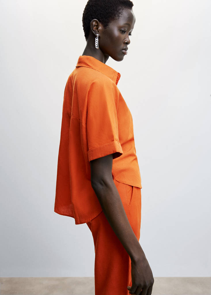 Straight design. Cotton-blend fabric. Linen mix. Flowy fabric. Straight design. Short design. Shirt-style collar. Short sleeve. Button fastening on the front section. Co-ord