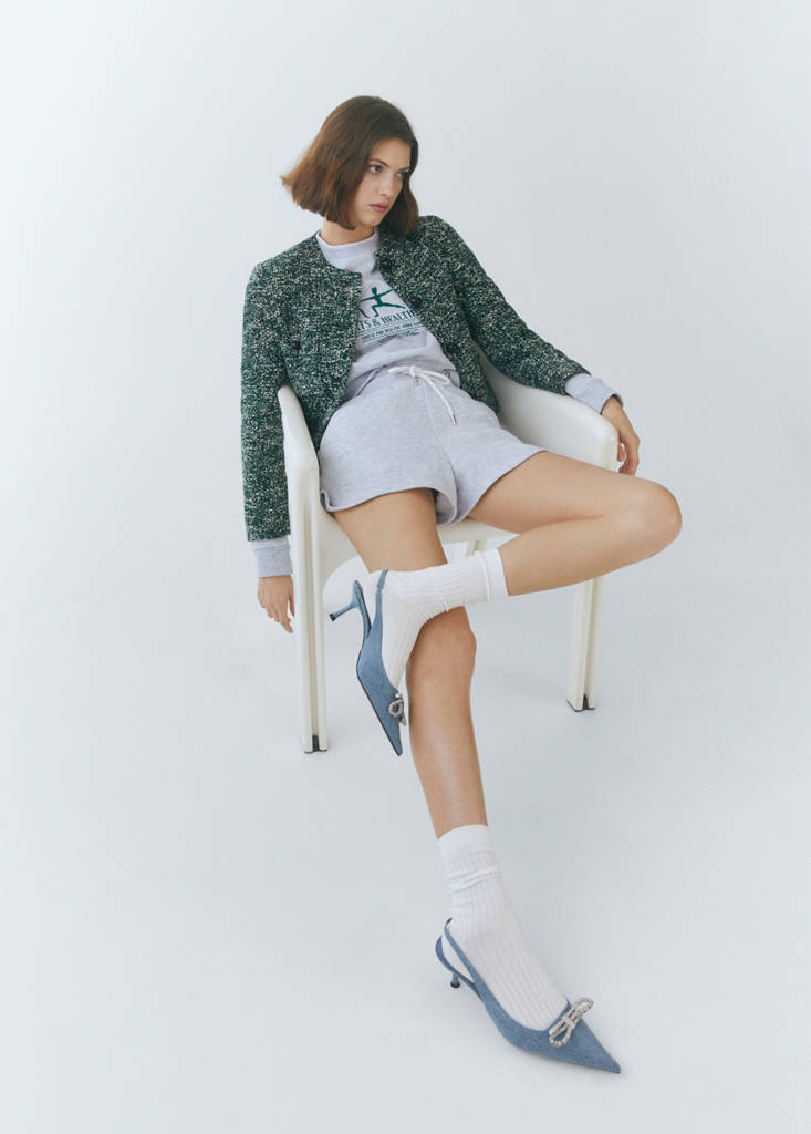 Denim style cotton fabric. Slip on design. Decorative crystals details. Pointed. Funnel heel. 6 cm heel