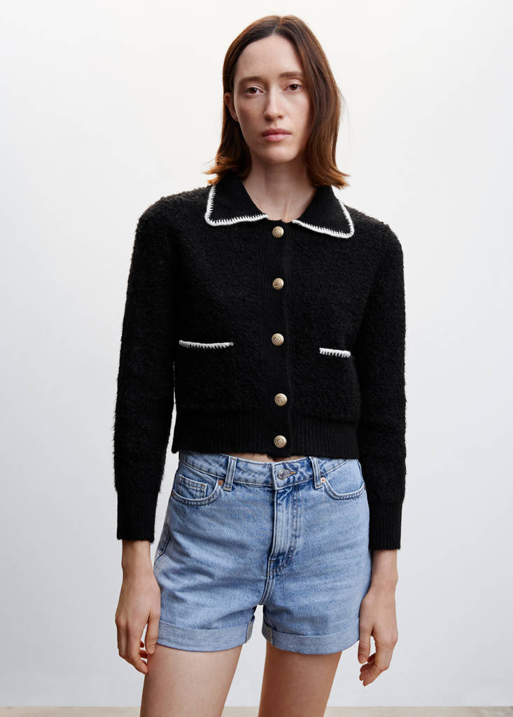 Contrast trims cardiganCurrent price [GEL 179,00 ]GEL 179,00Select a colourBlackSelect your sizeXXSXSSMLXLXXLDimensionsAdd to WishlistSee lookFree delivery to storeKnitted fabric. Medium knit. Straight design. Contrasting trims. Polo neck. Two patch pockets on the front. Jewel effect buttons. Button fastening on the front section. Long sleeveDetails, composition and careStore availability