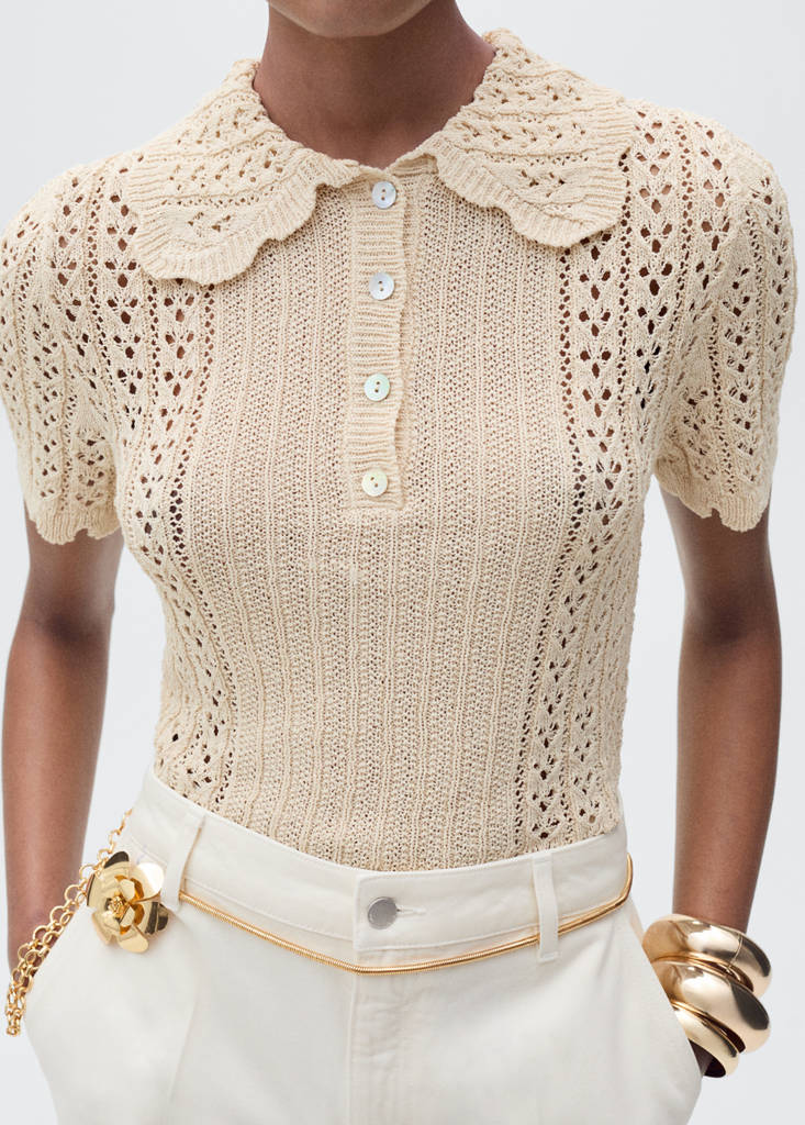 Open-knit fabric. Straight design. Polo collar. Short sleeves. Wavy hem. Button fastening at the neck