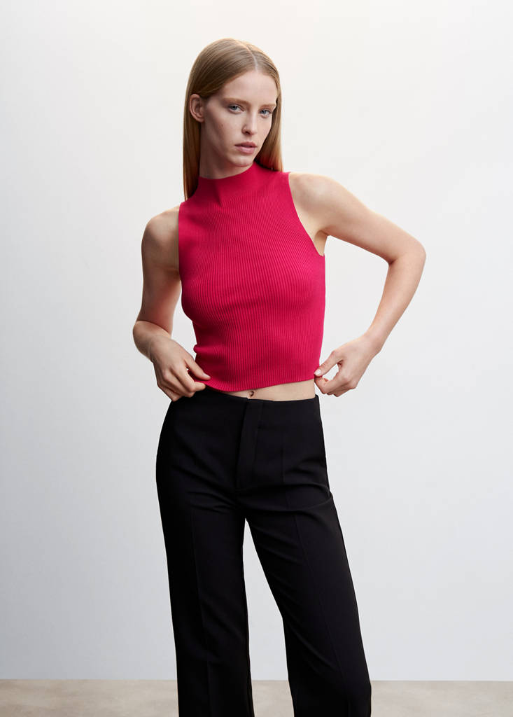 Fine knit fabric. Rib knit fabric. Fitted design. High collar. Sleeveless. Unclosed