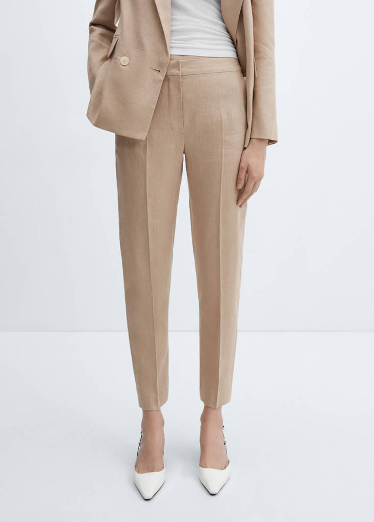 100% linen fabric. Straight design. Suit style. Two side pockets. Concealed button, hook and zip fastening. Elastic band on the back. Inner lining. Total look