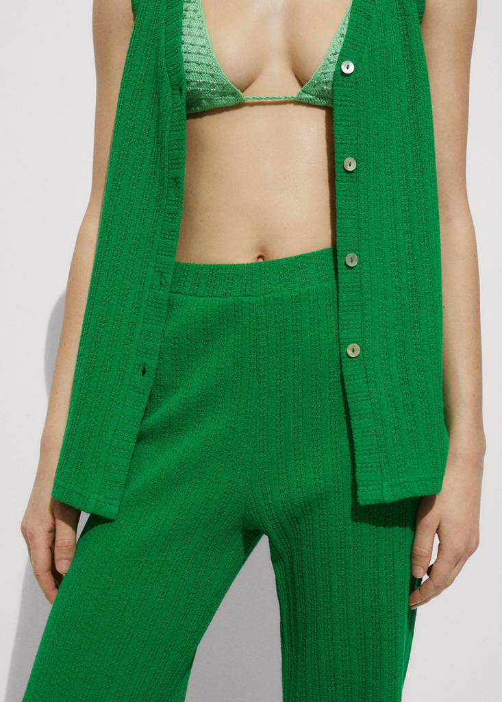 Straight crochet trousersCurrent price [GEL 89.00 ]GEL 89.00Select a colourGreenSelect your sizeXXSXSSMLXLXXL1XL2XL3XL4XLDimensionsAdd to WishlistSee lookFree delivery to storeCotton blend fabric. Straight design. Long design. Elasticated waistband. Hem with side slits. Available Plus. Total look. Festival Season. Crochet fabricDetails, composition and careStore availability
