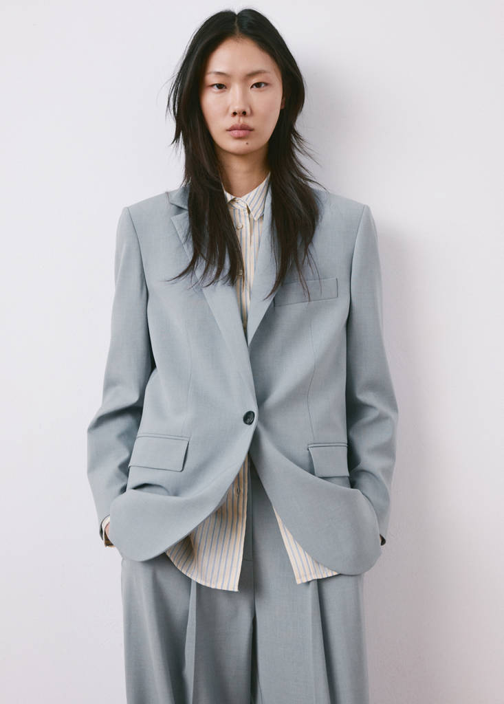 Style tailleur. Coupe droite. Col en V avec rabat. Revers à encoche. Manches longues et poignets boutonnés. Poche passepoilée sur la poitrine. Deux poches à rabat sur les côtés. Fermeture avant par bouton. Doublure intérieure. Total look