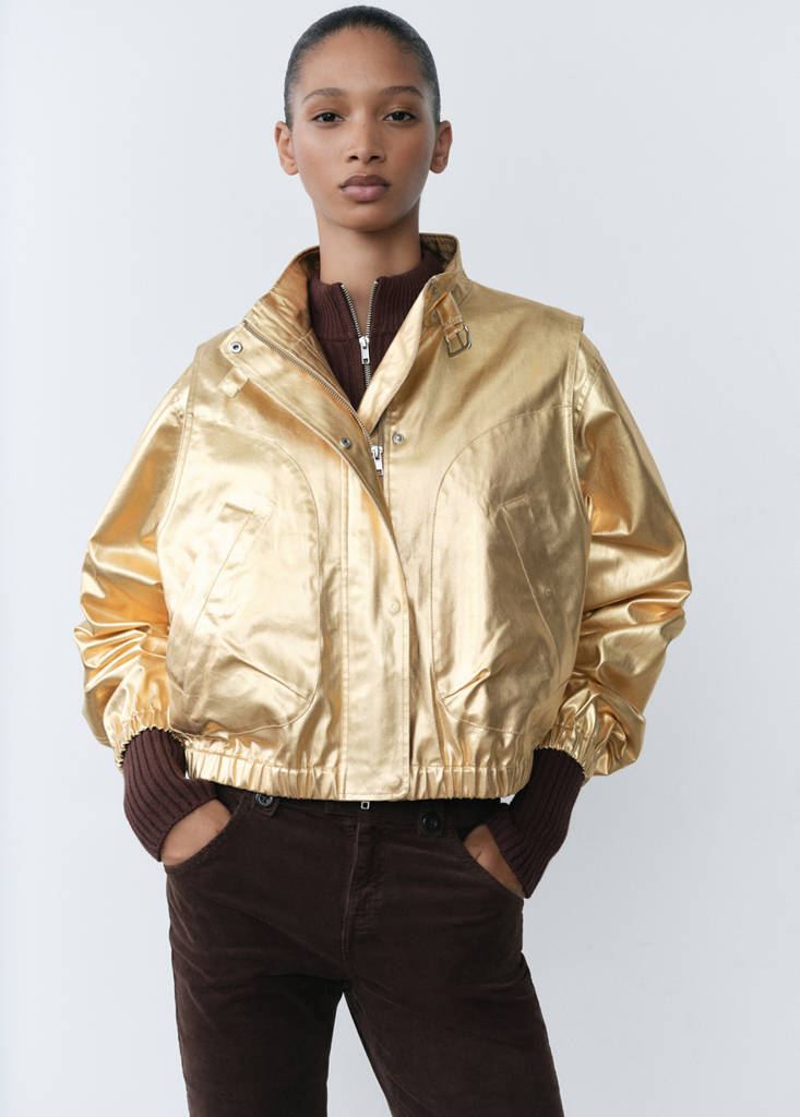 Style bomber. Col montant. Col à revers en pointe. Manches longues avec poignets élastiques. Bas élastique. Fermeture Éclair sur le devant. Fermeture à boutons-pression sur le devant. Deux poches latérales. Boucle ajustable. Tissu en coton de style jean. Tissu métallisé. Design oversize