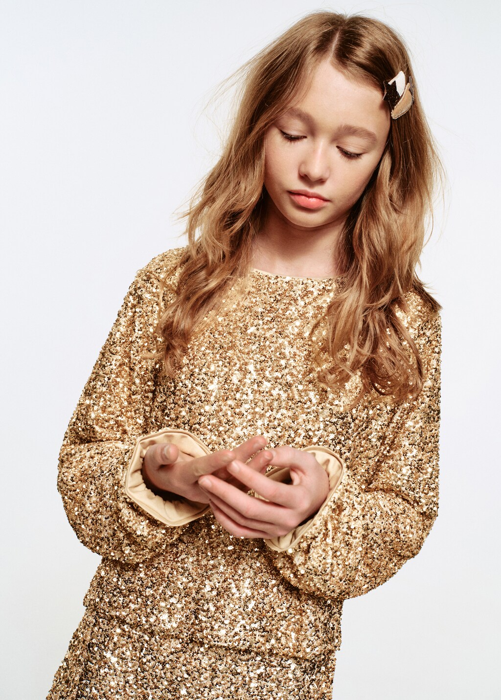 Tissu en sequins. Design brillant. Col rond boutonné. Manches longues avec poignets élastiques et fronces. Total look. Collection Noël. Collection fêtes et grandes occasions.