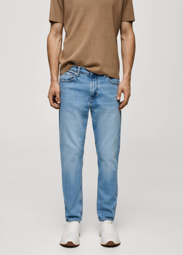 Tapered-fit : coupe large en haut qui se resserre depuis le genou jusqu’à la cheville. Tissu en coton. Style jean. Couleur bleu moyen. Passants de ceinture. Fermeture éclair et bouton. Deux poches latérales. Poche gousset. Deux poches plaquées à l'arrière