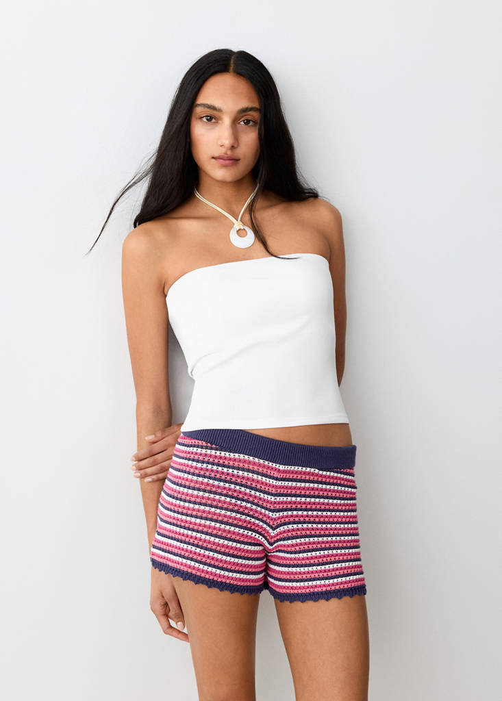 Tissu 100 % coton. Design crochet. Design Droit. Coupe mini. Multicolore. Taille élastique. Total look