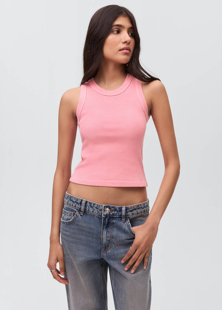 Ce vêtement contient ThePostFiber, une fibre innovante fabriquée à partir de vêtements et de textiles recyclés après consommation, qui leur donne une nouvelle vie et favorise la circularité dans la mode. Tissu 100 % coton. Tissu côtelé. Coupe droite. Col rond. Bretelles