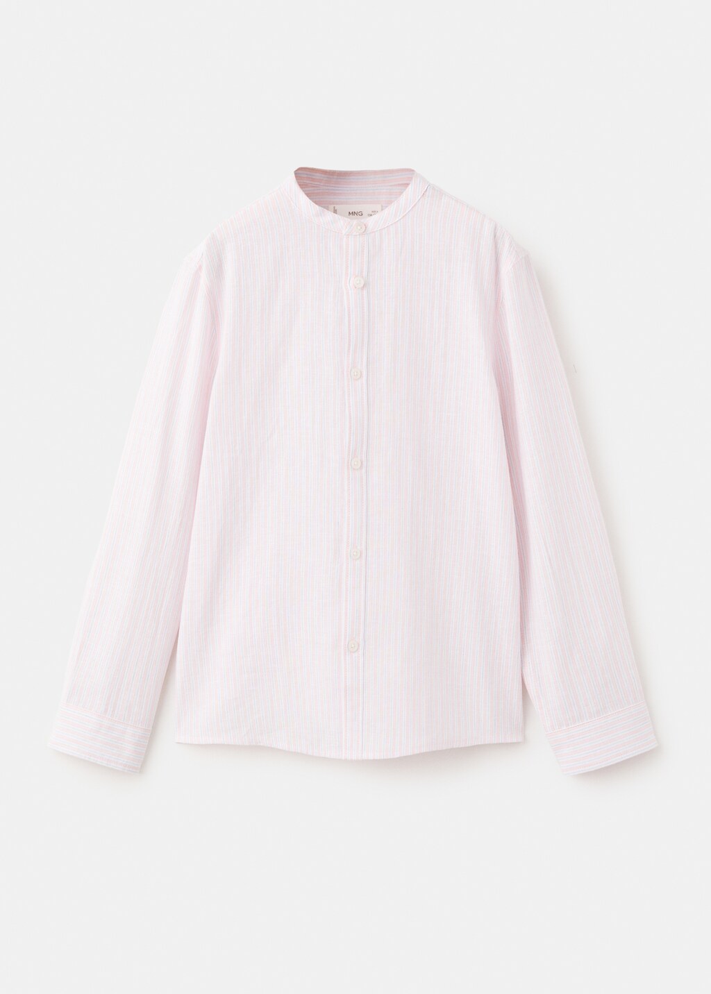 Linen and cotton blend fabric. Straight design. Two-tone stripe design. Stand-up collar. Long sleeves with buttoned cuffs. Front closure with buttons.