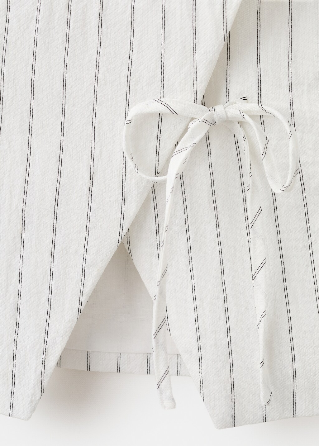 Straight design. Striped print. V-neck. Sleeveless. Wide strap. Crossed bow closure.