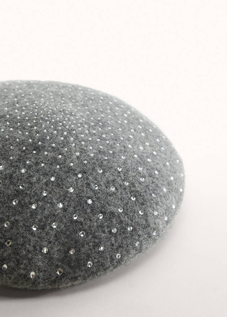 Rhinestone wool capCurrent price [£ 15.99 ]£ 15.99Select a colourMedium Heather GreySelect your sizeOne sizeAdd to WishlistSee lookFree delivery to storeWool mix fabric. Beret-style. Rhinestone detail. This garment belongs to our Gift GuideDetails, composition and careStore availabilityItem qualitiesWoolAt least 90%A natural fibre that creates durable garments and stands out for its capacity to regulate the body temperature.
