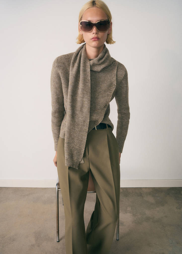 Long sleeves. Scarf neck. Button closure. Knit fabric. Midpoint. Straight design. High neck