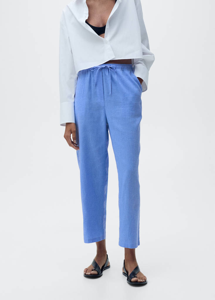 Cotton and linen blend fabric. Straight design. Long design. Mid-rise. Elasticated waistband. Adjustable waist tie. No Fastening. Available Plus.
