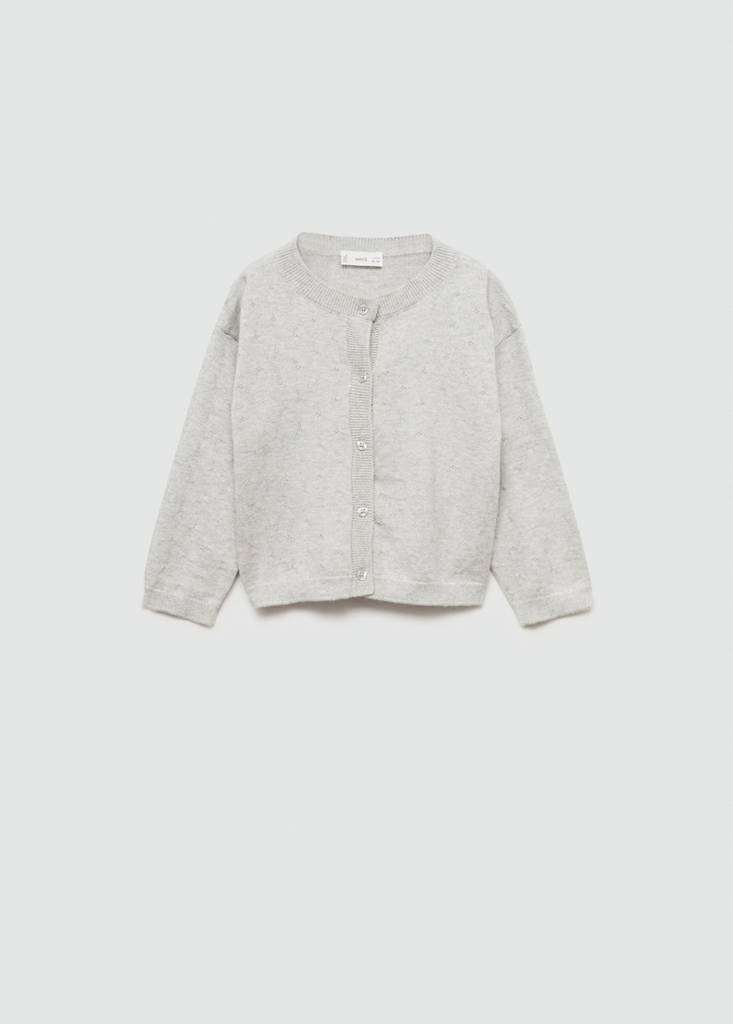 Button knit cardiganCurrent price [US$ 25.99 ]US$ 25.99Select a colourLight Heather GreySelect your size9-12 months (80cm)Not available. I want it!12-18 months (86cm)Not available. I want it!18-24 months (92cm)Not available. I want it!2-3 years (98cm)Not available. I want it!3-4 years (104cm)Not available. I want it!4-5 years (110cm)Not available. I want it!5-6 years (116cm)Not available. I want it!DimensionsNotify meAdd to WishlistSee lookFree delivery to storeBack to class. Fabric with cotton. Round neck. Button up. Straight design. Long sleevesDetails, composition and careStore availabilityItem qualitiesRecycled cottonAt least 20%This fibre is obtained from pre- and post-consumer textile waste that is transformed into new fabrics.