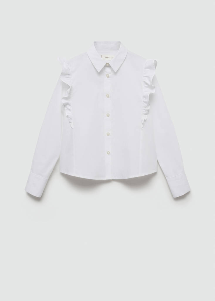 Back to school collection. Straight design. Ruffle detail. Long sleeves. Buttoned cuffs. Front closure with buttons