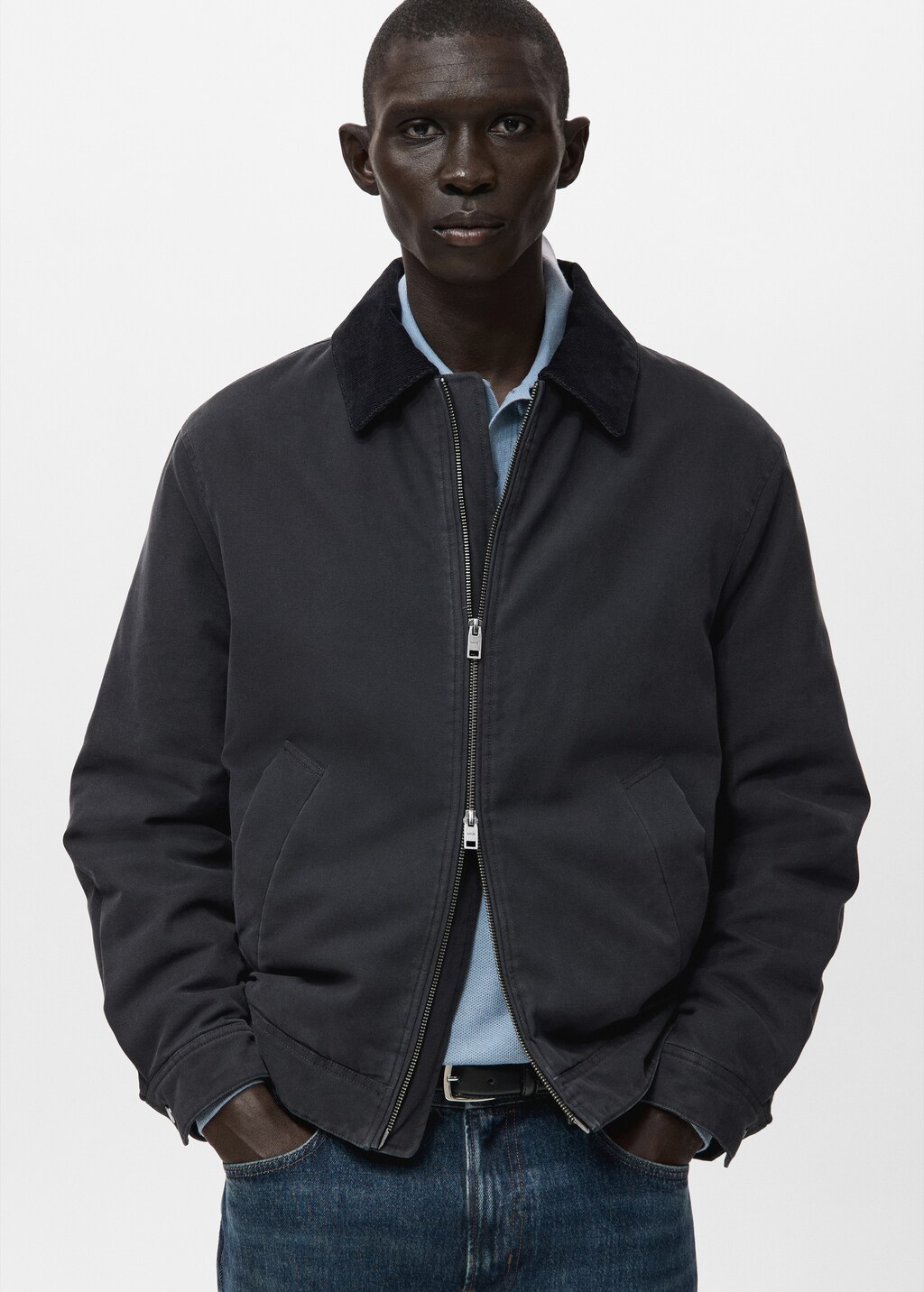 Regular fit. Denim-style cotton fabric. Quilted design. Corduroy collar. Two side welt pockets. Long sleeves with buttoned cuffs. Double zip closure.