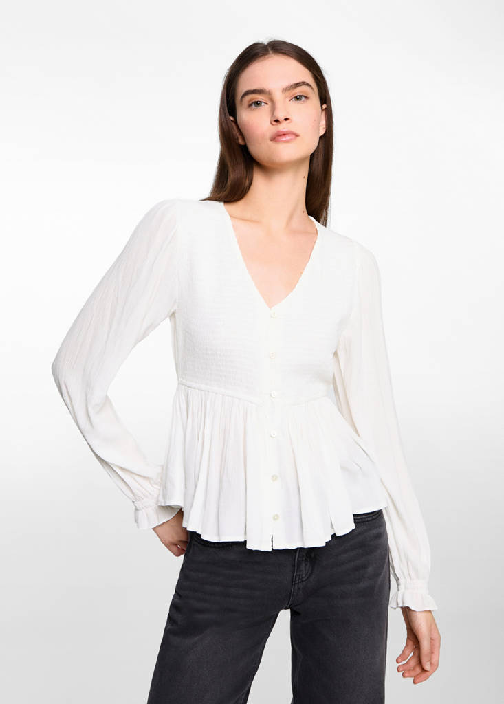 Ruched flowing blouseCurrent price [US$ 45.99 ]US$ 45.99Select a colourOff WhiteSmall garment - Choose one size up from the usualSelect your sizeXXSNot available. I want it!XSNot available. I want it!SNot available. I want it!MNot available. I want it!LNot available. I want it!XLNot available. I want it!Notify meAdd to WishlistSee lookFree delivery to storeV-neck. Ruched details. Long sleeves with ribbed trims. Front closure with buttons. Straight design. Fluid fabricDetails, composition and careStore availability