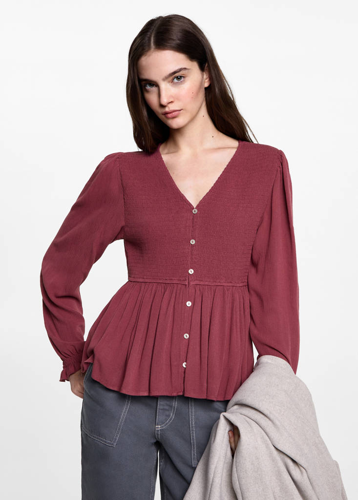 Ruched flowing blouseCurrent price [US$ 45.99 ]US$ 45.99Select a colourWineSmall garment - Choose one size up from the usualSelect your sizeXXSNot available. I want it!XSNot available. I want it!SNot available. I want it!MNot available. I want it!LNot available. I want it!XLNot available. I want it!Notify meAdd to WishlistSee lookFree delivery to storeV-neck. Ruched details. Long sleeves with ribbed trims. Front closure with buttons. Straight design. Fluid fabricDetails, composition and careStore availability
