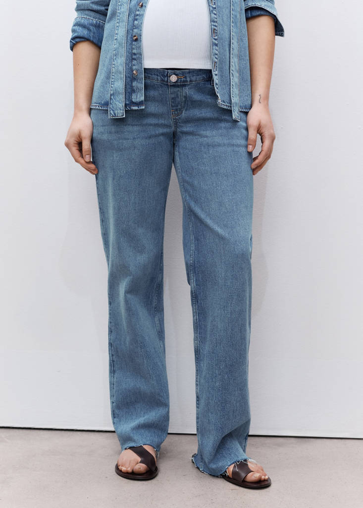 Denim-style cotton fabric. Wide-leg design. Long design. Low waist. Belt loops. Five pockets. Soft elastic at front side waistband for added comfort and support the growing bump. No Fastening. Decorative button. Inseam 78 cm. We recommend you buy your usual size. Provides comfort and freedom of movement. Maternity. Elastic band. Wide leg. Elasticated waistband
