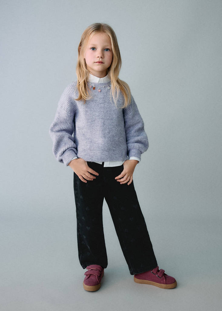Tissu 100 % coton. Tissu en denim. Coupe droite. Motif cœurs. Passants pour ceinture. Fermeture à boutons. Deux poches latérales. Deux poches plaquées à l'arrière. Collection Noël