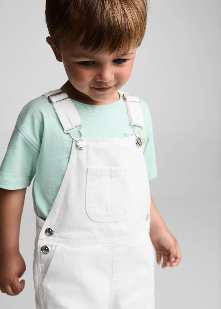 Tissu en coton de style jean. Coupe courte. Coupe droite. Bretelles larges. Bretelles avec fermeture à bouton. Bretelles ajustables. Col droit. Deux poches latérales. Poches plaquées à l'arrière. Fermeture à boutons latéraux. Summer camp