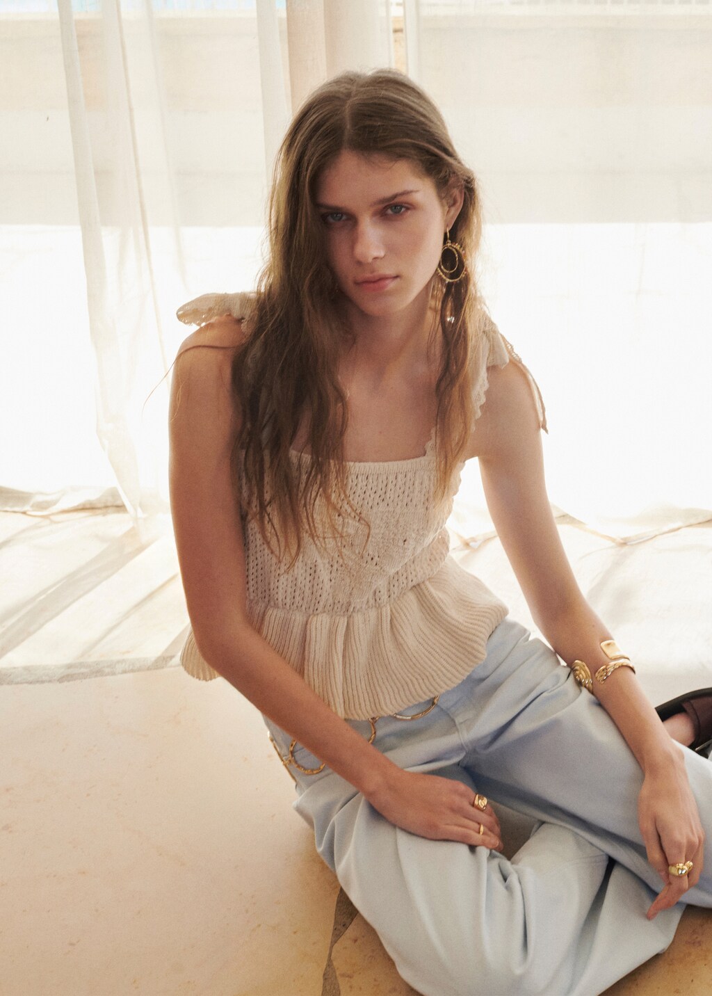 Maille ajourée. Tissu en coton. Col droit. Bretelles à nouer. Détails brodés. Détail d'ouverture.