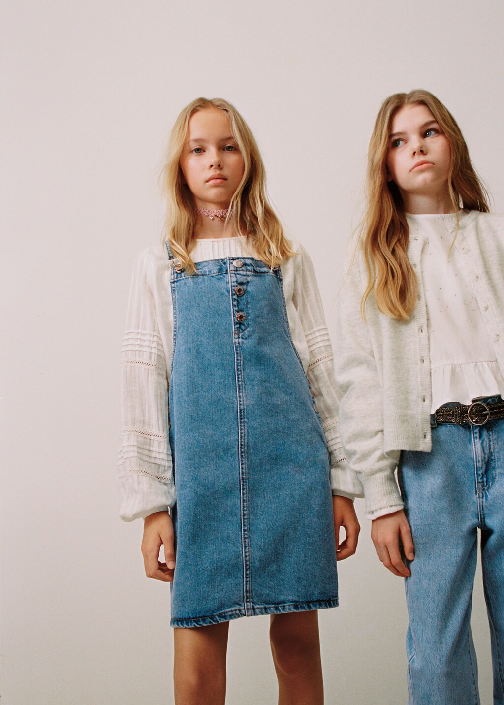 Long Long. Structure plate moyenne. Tissu 100% coton. Tissu en denim. Coupe droite. Coupe courte. Boutons décoratifs. Encolure carrée. Bretelles avec fermeture à bouton. Bretelles ajustables. Fermeture à boutons latéraux.