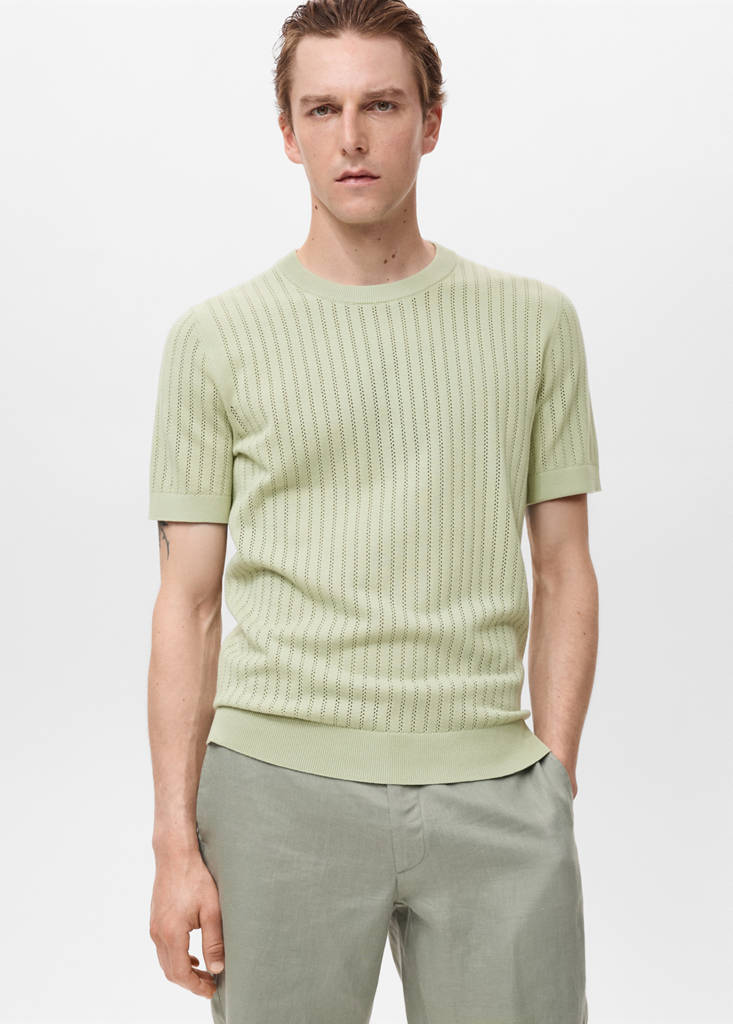 Confectionnée en tissu 100 % coton, cette pièce présente une coupe regular-fit et un design en maille fine ajourée à rayures. Le col, les manches et le bas sont côtelés. Le mannequin mesure 1,90 m et porte une taille M