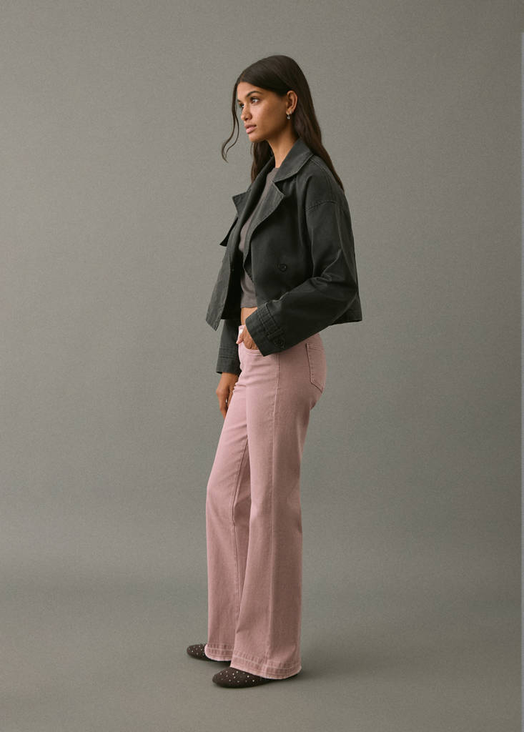 Tissu de coton. Tissu élastique. Design long. Style flare. Taille Regular Waist. Passants pour ceinture. Fermeture par bouton et zip. Poche gousset. Deux poches latérales. Deux poches plaquées à l'arrière. Coutures décoratives
