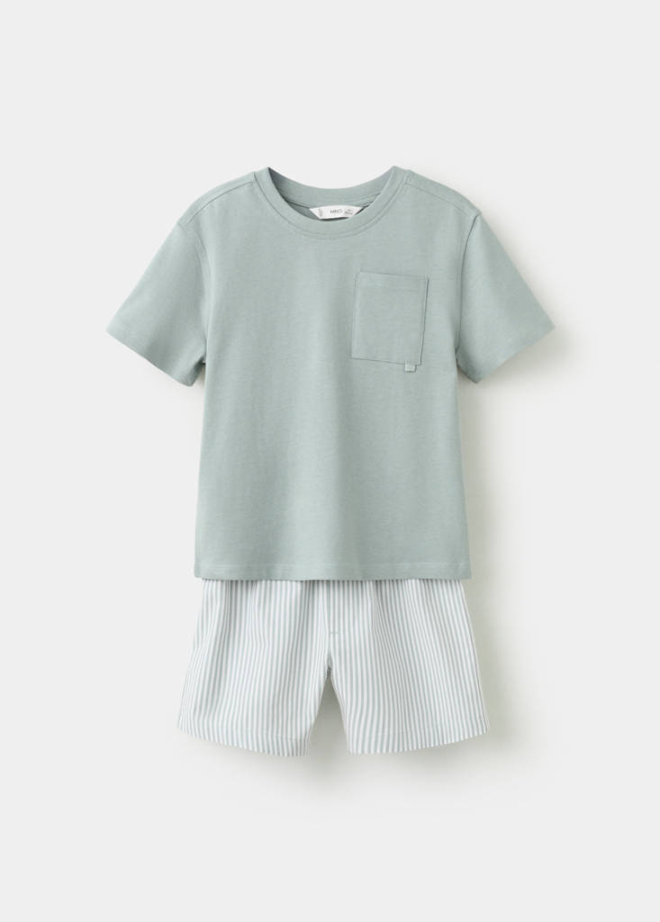 Tejido 100% algodón. Pack de camiseta de manga corta y pantalón corto de pijama. Detalle bolsillo pecho. Pantalón corto de rayas. Cintura elástica con cordón